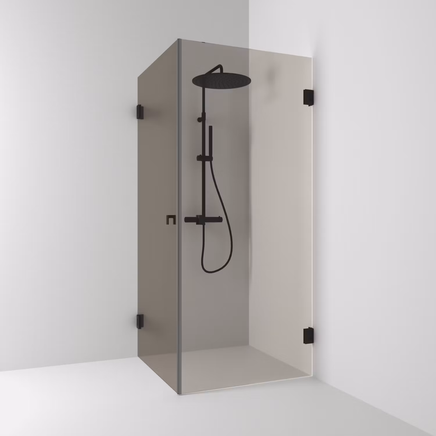 180° hörndusch rak 100x100 med två öppningsbara dörrar i bronsglas och pulverlackerade profiler i svart matt. Hörnduschen har 8 mm härdat säkerhetsglas och själ