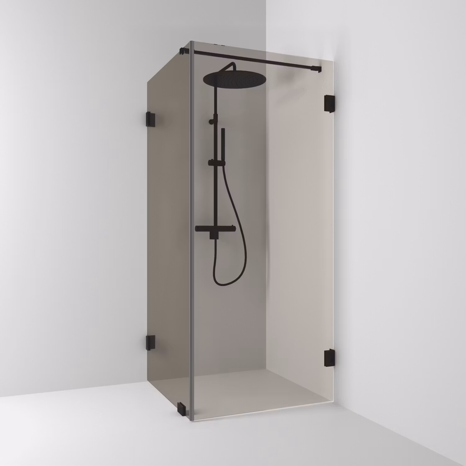 180° hörndusch rak/fast 80x100 med en dörr och ett fast glas i bronsglas samt pulverlackerade profiler i svart matt. Hörnduschen har 8 mm härdat säkerhetsglas o