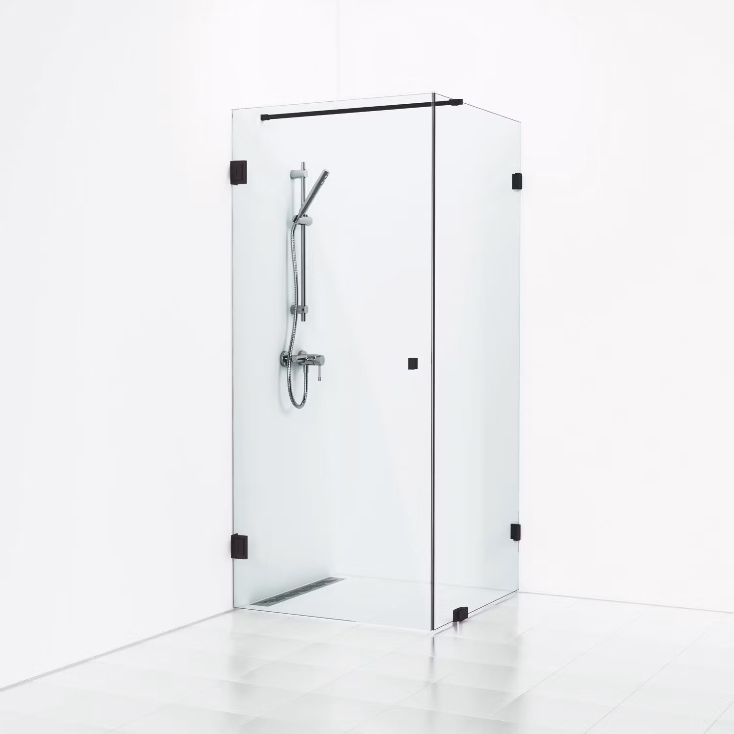 180° hörndusch rak/fast 80x80 med en dörr och ett fast glas i klarglas med pulverlackerade profiler i svart matt. Hörnduschen har 8 mm härdat säkerhetsglas och