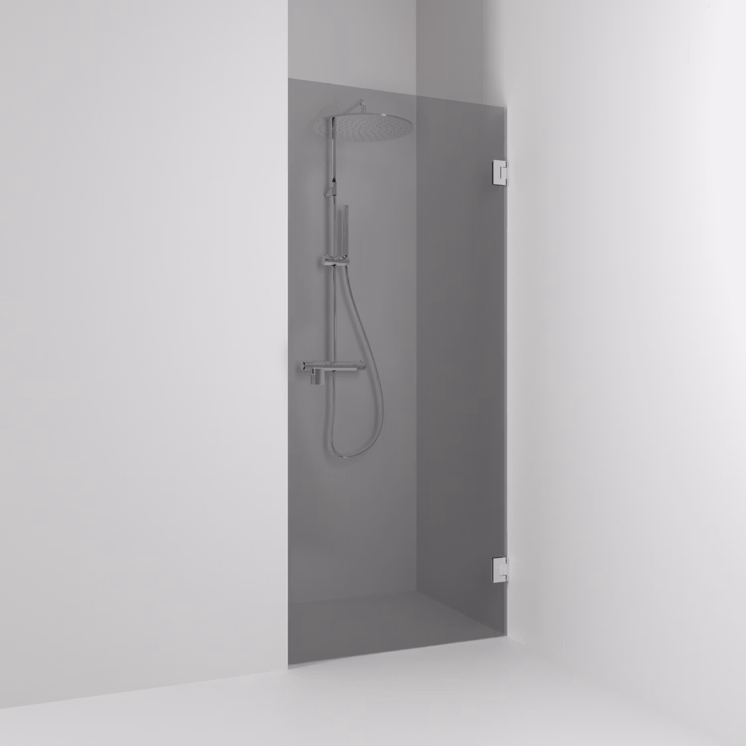 180° nischdusch enkel 88.5 med en öppningsbar dörr i rökglas och profiler i krom. Nischdusch med 8 mm härdat säkerhetsglas och självstängande gångjärn. B: 88,5