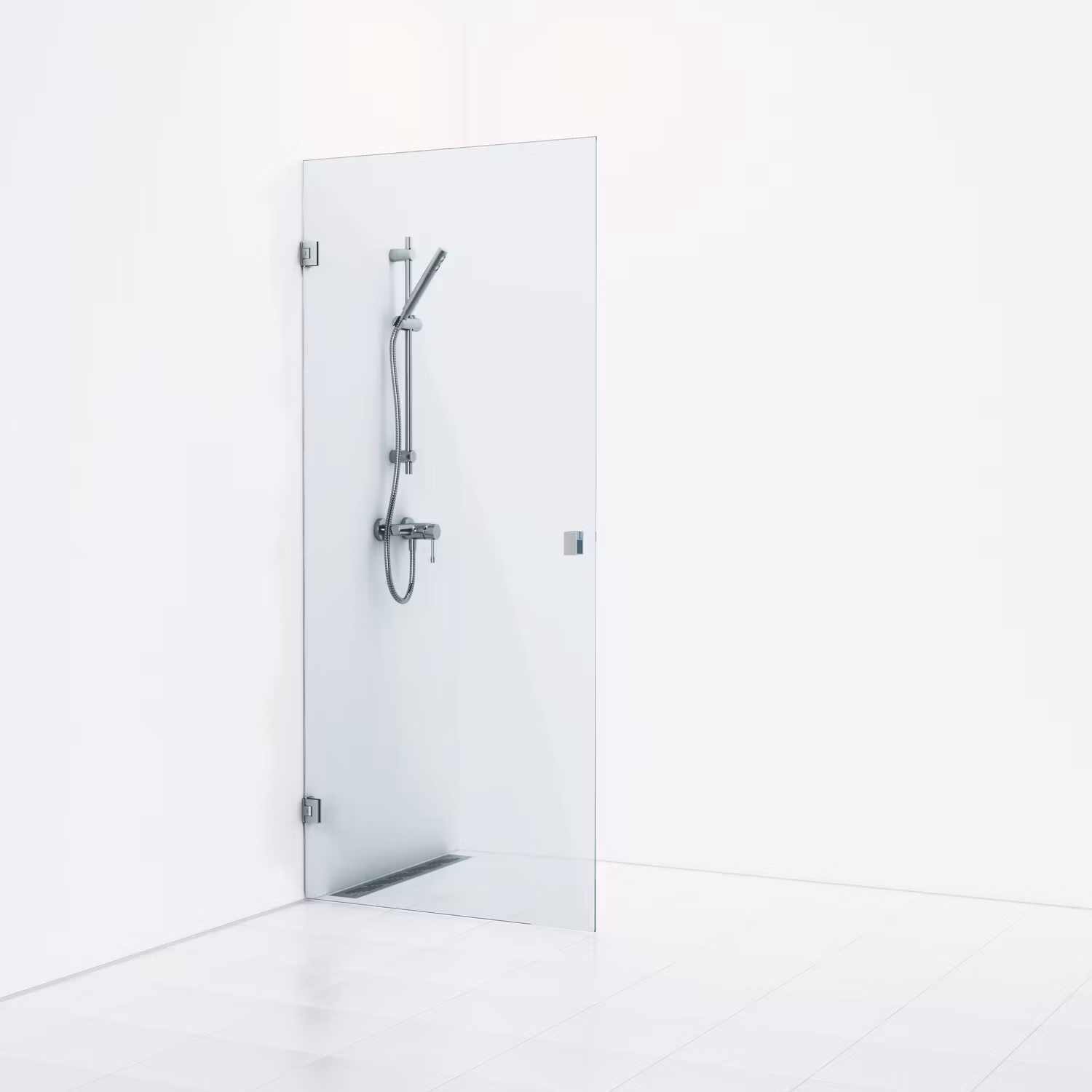 180° nischdusch 98.5 med en öppningsbar dörr i klarglas med profiler i krom. Nischdusch med 8 mm härdat säkerhetsglas och självstängande gångjärn. B: 98,5 H: 20