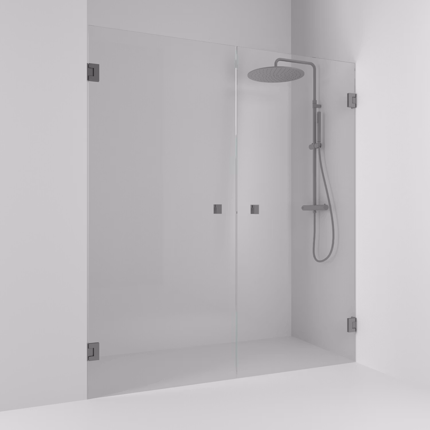 180° nischdusch dubbel 156.5 med en två öppningsbara dörrar i klarglas och profiler i blyertssvart. Nischdusch med 8 mm härdat säkerhetsglas och självstängande