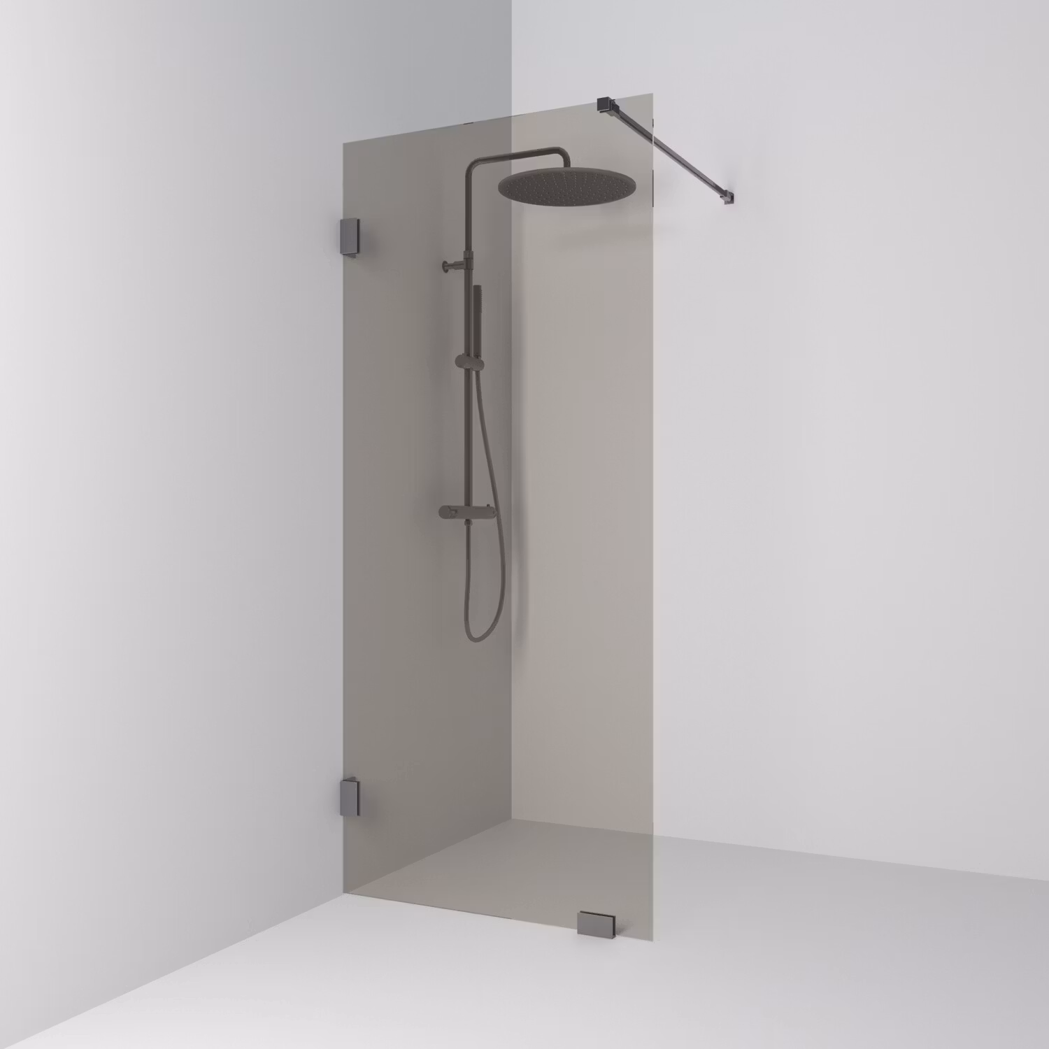 180° skärmvägg fast 78 med ett glas i bronsglas och profiler i blyertssvart. Skärmvägg med 8 mm härdat säkerhetsglas. B: 78 H: 200 D: 0,8 Passar till 96858|96868|96859|96869|6573|6583|6329|6659
