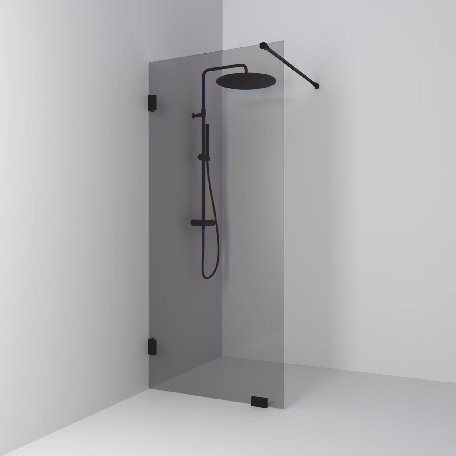 180° skärmvägg fast 98 med ett glas i rökglas och pulverlackerade profiler i svart matt. Skärmvägg med 8 mm härdat säkerhetsglas. B: 98 H: 200 D: 0,8