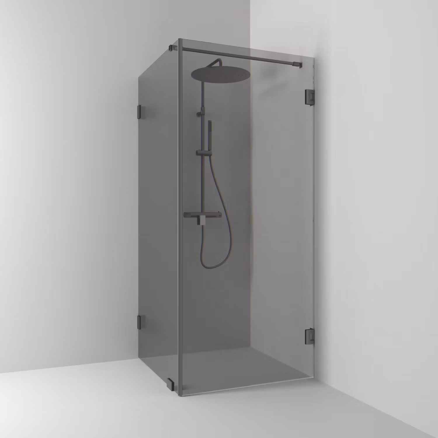 180° hörndusch rak/fast 90x100 med en dörr och ett fast glas i rökglas samt profiler i blyertssvart. Hörnduschen har 8 mm härdat säkerhetsglas och självstängande gångjärn. B: 100 H: 200 D: 90 Passar till 96858|96868|96859|96869|6573|6583|6329|6659