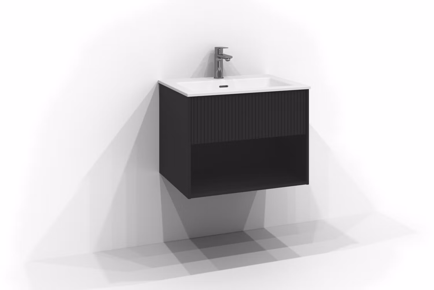 Epos underdel 60x45 i svart ask med Rand front och push open. Tvättställsskåpet har 1 låda med mjukstängande lådskena som gör att hela lådans längd kan användas