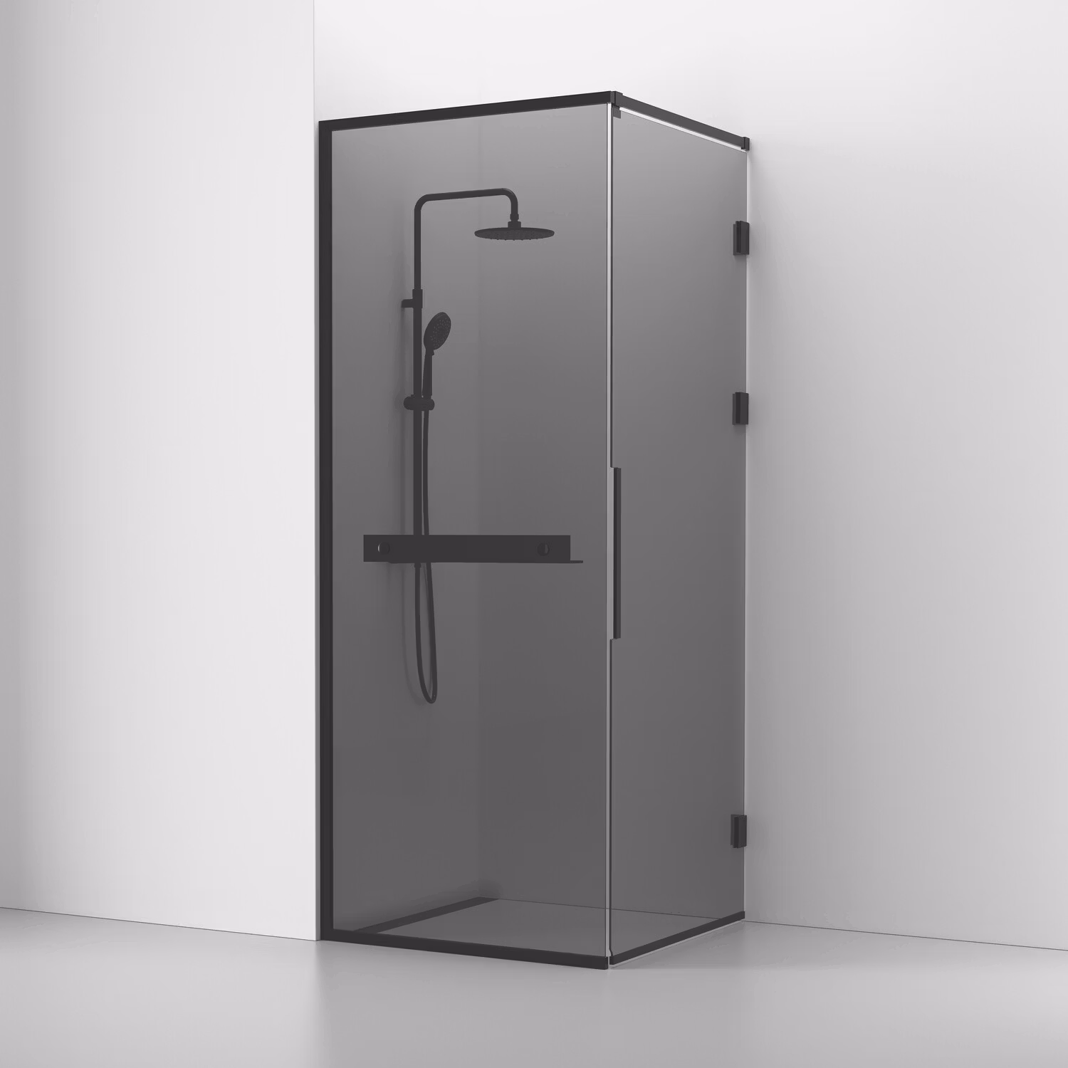 Langfoss hörndusch kombi 80x82 med en fast skärm och en öppningsbar dörr i rökglas samt anodiserade profiler i svart matt. Levereras komplett med lättmonterad hylla, draperistång (max 105 cm), vägg- och golvprofil. Härdat säkerhetsglas 6 mm. Självstängande gångjärn. B: 80 H: 230 (231 cm ovankant med tillvalet gardinskena) D: 82 Passar till 96851|96861|96853|96863|682|63232|683|684|6826572|6582|6325|6651