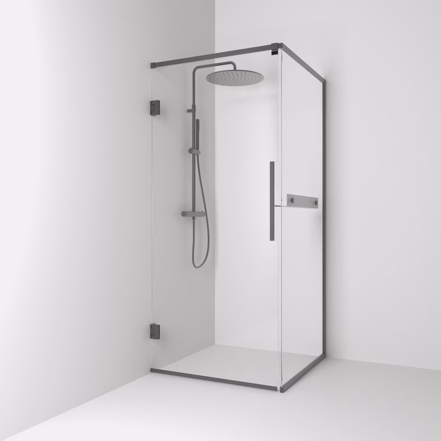 Langfoss hörndusch kombi 80x92 med en fast skärm och en öppningsbar dörr i kristallglas samt pulverlackerade profiler i blyertssvart. Levereras komplett med lät