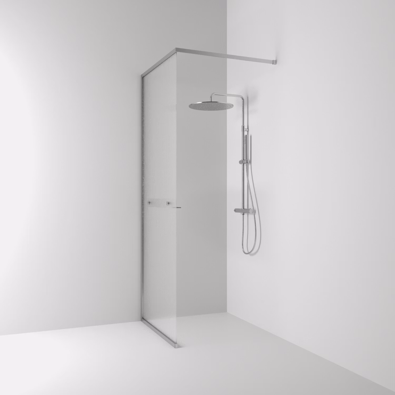 Langfoss fast skärmvägg 80 i linjeglas med anodiserade i matt aluminium. Levereras komplett med lättmonterad hylla, draperistång (max 105 cm), vägg- och golvpro