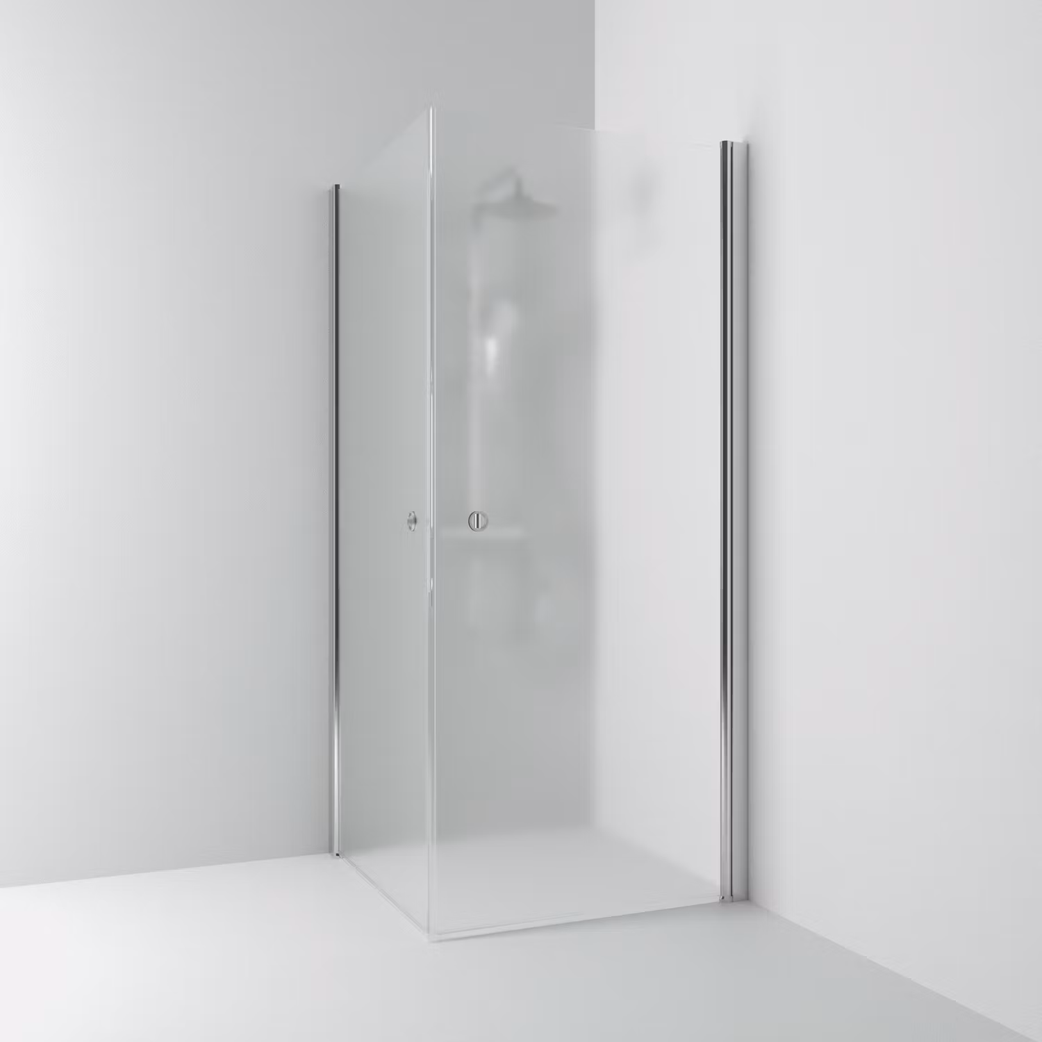 Skoga hörndusch rak 70x100 med två öppningsbara dörrar i frostglas och anodiserade profiler i blank aluminium. Dörrarna har hålgrepp och kan vikas inåt när dusc
