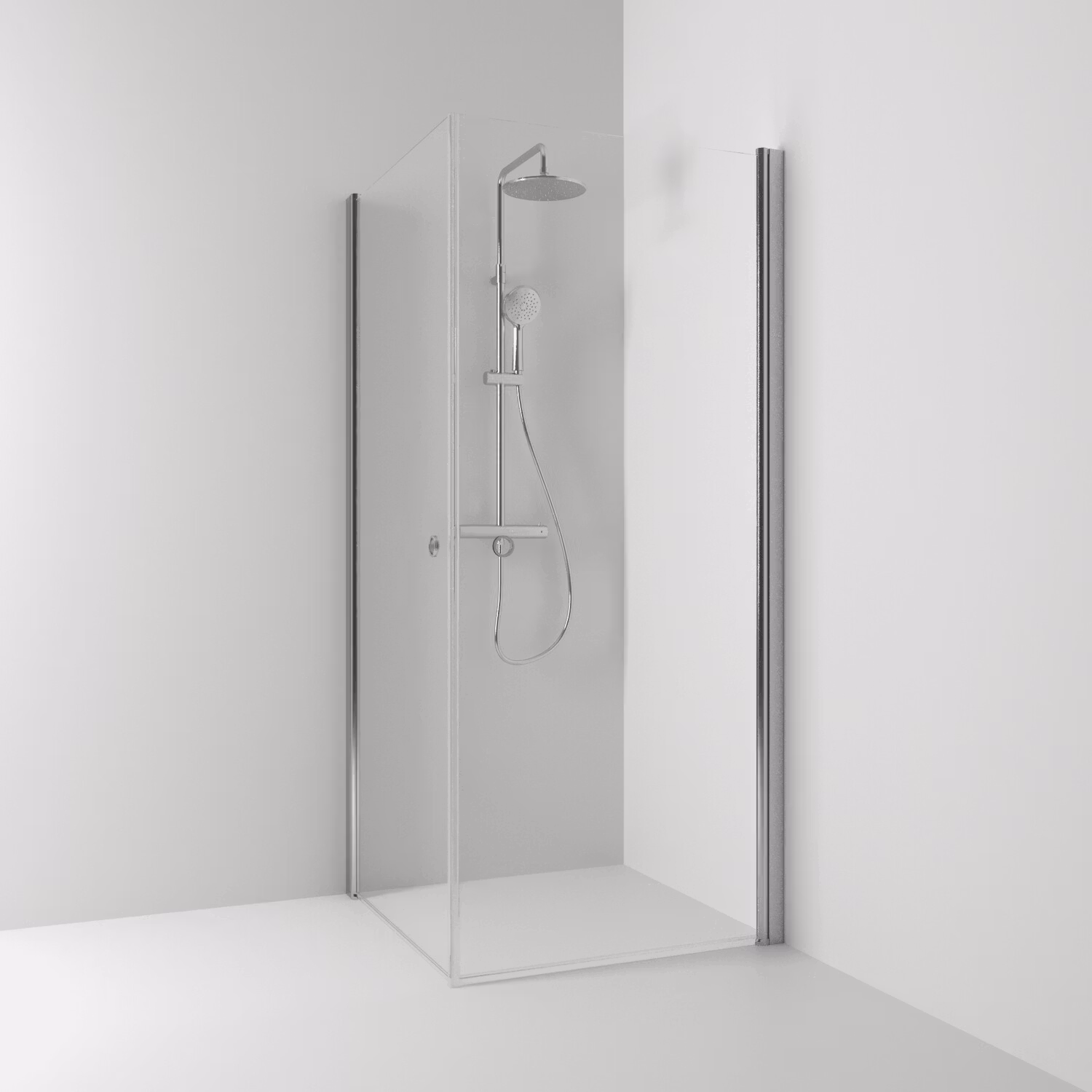 Skoga hörndusch rak 90x100 med två öppningsbara dörrar i klarglas och anodiserade profiler i matt aluminium. Dörrarna har hålgrepp och kan vikas inåt när dusche
