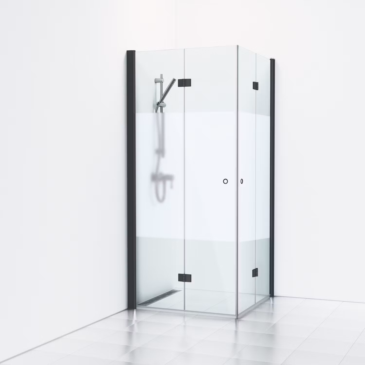 Skoga vikhörndusch 70x70 med två öppningsbara dörrar i halvfrost och pulverlackerade profiler i svart matt. Dörrarna har hålgrepp och kan öppnas/vikas inåt, pra