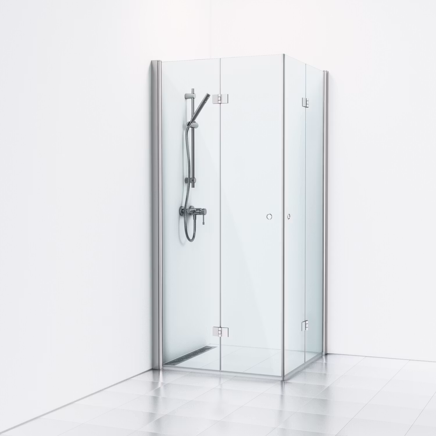 Skoga vikhörndusch 80x80 med två öppningsbara dörrar i klarglas och anodiserade profiler i blank aluminium. Dörrarna har hålgrepp och kan öppnas/vikas inåt, pra